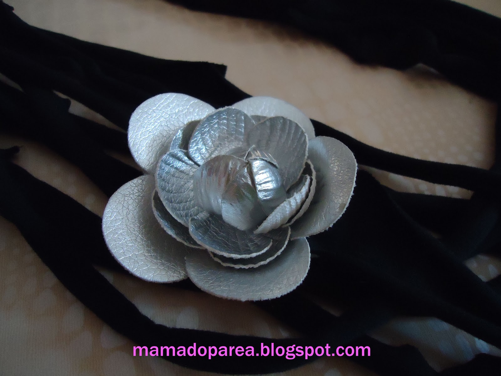 5.Τέλος για να ομορφύνω το κολιέ μου έραψα επάνω ένα ασημένιο δερμάτινο λουλούδι!