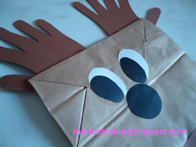 Πώς να το φτιάξετε: Γυρίστε  την σακούλα από την κάτω μεριά(να βλέπετε τον πάτο της σακούλας) Για να φτιάξετε τα κέρατα του τάρανδου χρησιμοποιήστε ένα κανσόν σε καφέ χρώμα και απλά σχεδιάστε επάνω την παλάμη σας.(η του παιδιού σας). Κόψτε γύρω απο το περίγραμμα και κολλήστε τις παλάμες δεξιά και αριστερά στις επάνω γωνίες της σακούλας ώστε να μοιάζουν με κέρατα! Χρησιμοποιήστε το λευκό κανσόν για να φτιάξετε τα μάτια,το σκούρο καφέ για το κολάρο & κολλήστε τα επάνω στη σακούλα. Κολλήστε ένα μάυρο κύκλο απο κανσόν στη θέση της μύτης.