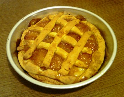 Πάνω στη ζύμη απλώνουμε την μαρμελάδα που την έχουμε μαλακώσει στη φωτιά με το κονιάκ. Πλάθουμε την υπόλοιπη ζύμη σε λωρίδες και τις βάζουμε σταυρωτά πάνω από την μαρμελάδα. Αλείφουμε την επιφάνεια με αυγό και την ψήνουμε σε ζεστό φούρνο για μισή ώρα.