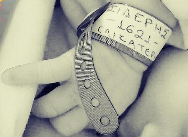 Τους χαιρετάω βιαστικά,πάμε να ξεκινήσουμε την προετοιμασία(ότι περιλαμβάνει για μια γυναίκα που θα προσπαθήσει να γεννήσει φυσιολογικά)ναι,η αλήθεια είναι ότι για μένα η όλη προετοιμασία δεν ήταν και η καλύτερη στιγμή μου….λίγο αστεία,λίγο περίεργη,λίγο πέρα από τα συνηθισμένα….Δεν μου άρεσε,όμως τι να κάνεις;Σκέφτεσαι τα άτομα που σε περιμένουν έξω και χαμογελάς,σκέφτεσαι ότι σε λίγες η πολλές ώρες θα γεννάς,για αυτό περνάς τώρα ότι περνάς….Η προετοιμασία τελείωσε,η πρώτη φωτογραφία ήταν το βραχιολάκι που μου φόρεσαν με το όνομα μου λόγω εισαγωγής….