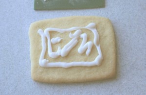 Στη συνέχεια άπλωσε γλάσο πάνω στα μπισκότα ώστε να κολλήσει εκεί η ζαχαρόπαστα……