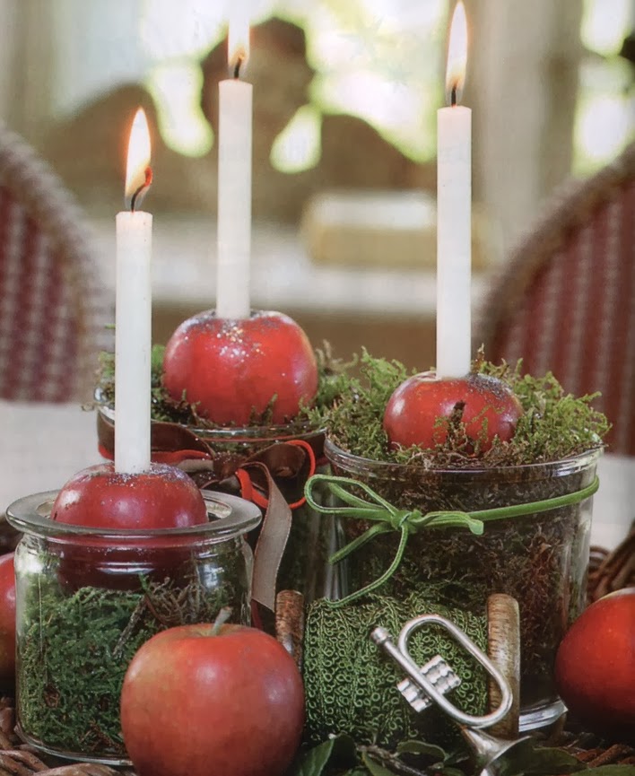 Τα μήλα και τα ρόδια εκτός που θα προσφέρουν το κόκκινο γιορτινό τους χρώμα σε οποιαδήποτε επιτραπέζια σύνθεση, θα γίνουν εξαιρετικής αισθητικής κηροπήγια απλώς ανοίγοντας στο πάνω μέρος τους μια τρύπα ή κόβοντας ένα μικρό κομμάτια για να σφηνώσετε ένα ρεσώ ή οποιοδήποτε κερί.