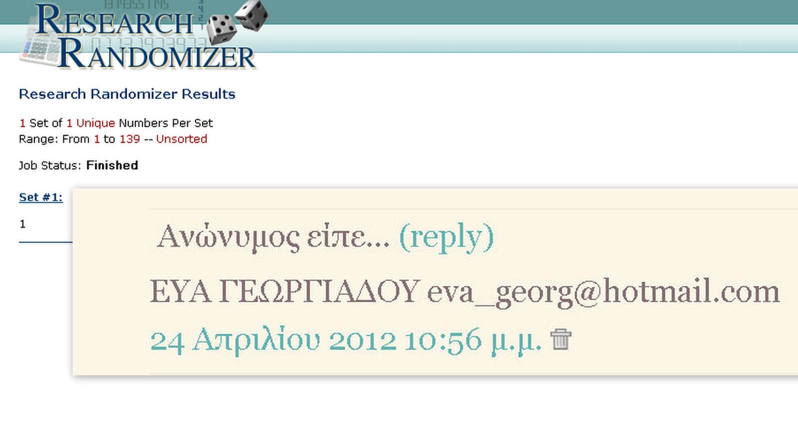 Οι συμμετοχές σας ήταν 144 ενώ οι έγκυρες 139.(τα διπλά σχόλια και τα σχόλια χωρίς όνομα ή email θεωρούνται άκυρα).