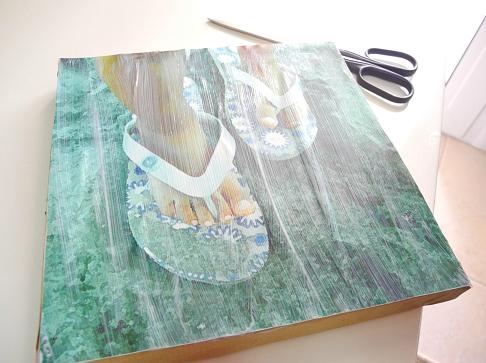 Βήμα 5: Καλύπτουμε όλη τη φωτογραφία με κόλλα. Στην αρχή θα είναι άσπρη, αλλά σιγά σιγά γίνεται διάφανη. Την αφήνουμε αρκετή ώρα να στεγνώσει καλά. Αν κάνει φουσκάλες δεν την πειράζουμε. !!!!!!!!!!!!Θα πέσουν όταν στεγνώσει.