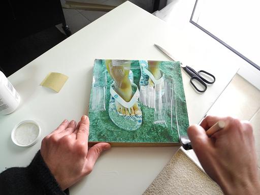 Βήμα 4: Απλώνουμε κόλλα σε όλη την επιφάνεια του καμβά και στο πίσω μέρος της φωτογραφίας μας και την τοποθετούμε με προσοχή πάνω.