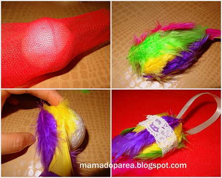 Πήρα την κόλλα μου και άρχισα να κολλάω επάνω τους ότι υλικό είχα μπροστά μου!Λίγο τουλάκι,χρωματιστά φτερά,μιά λευκή δαντελίτσα,στράς,κτλ…