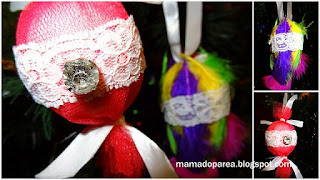 Την μια απο τις δύο μπάλες μου μάλιστα την τύλιξα με τούλι το οποίο στερέωσα στο πίσω μέρος με μία καρφίτσα και στη συνέχεια έδεσα τις δύο άκρες του με κορδέλα ώστε να μοιάζει με καραμελίτσα.