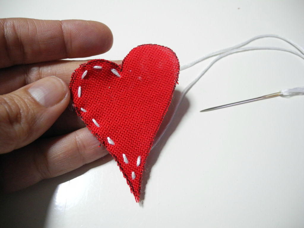 Βήμα 3: Ενώνουμε τις 2 καρδίες και ξεκινάμε να ράβουμε γύρω γύρω , κρύβοντας τον κόμπο στην εσωτερική πλευρά, ακολουθώντας το περίγραμμα της. Ξεκινάμε το ράψιμο από το πάνω μέρος της καρδιάς,κανοντας ουσιαστικά εξώραφα.