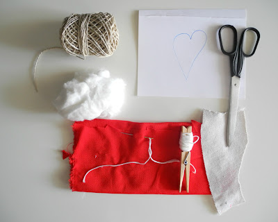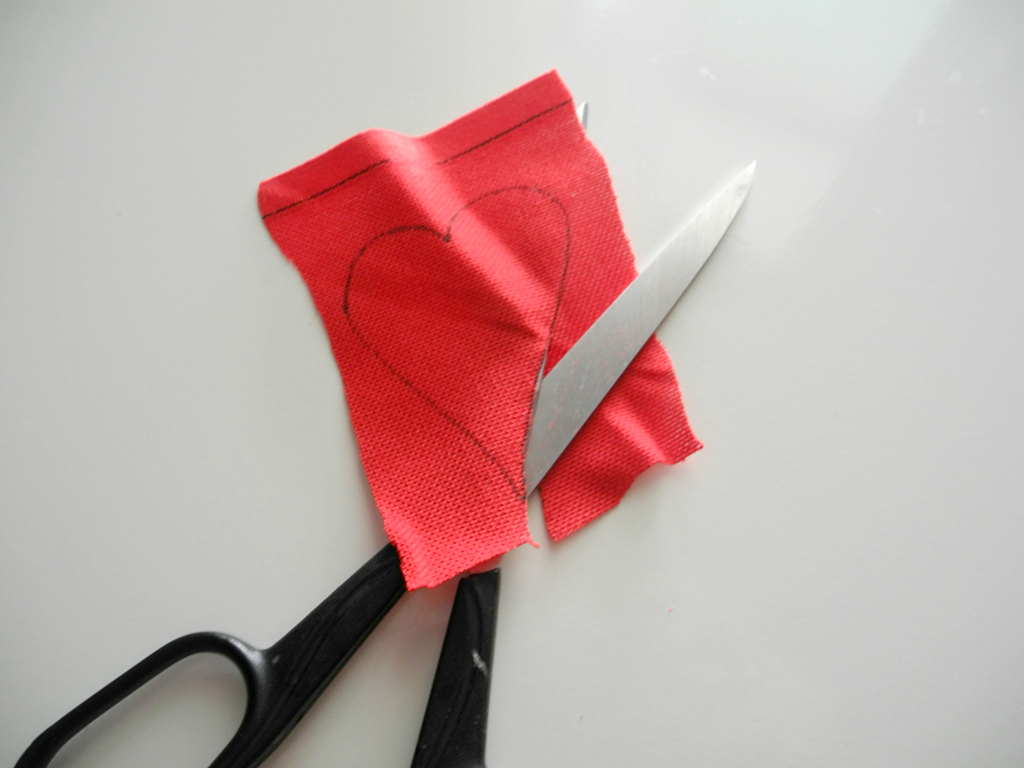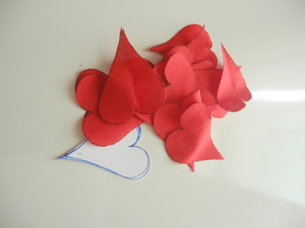 Βήμα 1: Σχεδιάζουμε στο χαρτόνι μας μια καρδιά και κόβουμε το περίγραμμα της. Με οδηγό το χαρτόνι μας σχεδιάζουμε πάνω στο κόκκινο ύφασμα 14 καρδιές.