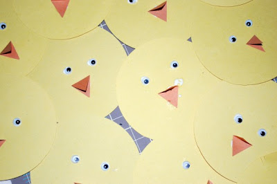 - Θα χρειαστούμε χαρτί κανσον σε κίτρινο χρώμα.Θα το κόψουμε σε μεγάλα στρογγυλά κομμάτια,χρησιμοποιώντας διαβήτη για να βγούν ομοιόμορφα!Αυτό θα είναι το κεφαλάκι του κοτόπουλού μας!