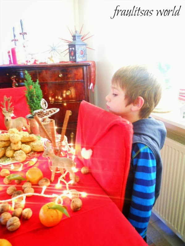 Τίποτα ιδιαίτερο και υπερβολικό. Με απλά πράγματα, τα οποία είχα ήδη στο σπίτι, μετέτρεψα την τραπεζαρία σε γιορτινό μπουφέ. Λίγα καρύδια και μανταρίνια, φυτά από το μπαλκόνι, τα αγαπημένα μου ελάφια, ξύλα κανέλας, κουραμπιέδες και μελομακάρονα που πρόλαβα να φτιάξω το Σάββατο με τα παιδιά, σοκολατένιοι χιονάνθρωποι κι Αγιοβασίληδες και μικρά σνακ, όλα αυτά μαζί με λίγα λαμπιόνια τριγύρω, κατάφεραν να χαρίσουν στο τραπέζι μια ζεστασιά, που τα Χριστούγεννα την έχουμε ανάγκη.