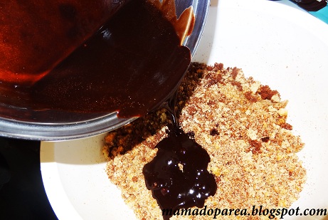 2ο βήμα:Σε μπεν μαρί λιώνουμε ένα φακελάκι γλάσο σοκολάτας Γιώτης και 30γρ βούτυρο.Ανακατεύουμε καλά μέχρι να λιώσει καλά και στη συνέχεια το ρίχνουμε στο κέικ που έχουμε τρίψει.Ανακατεύουμε-πλαθουμε καλά με τα χέρια μας μέχρι το μείγμα μας να γίνει σαν μια μεγάλη συμπαγής μπάλα.