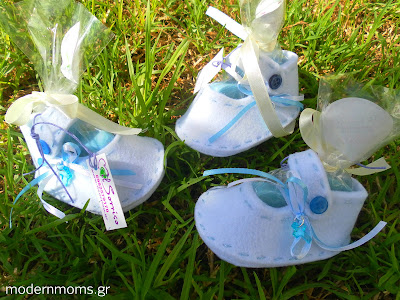 Υπάρχουν πολλές ιδέες για δωράκια,και τι πιο πρωτότυπο από μερικά τόσοδούλικα παπουτσάκια με περιεχόμενο σαπουνάκια για την φροντίδα του νεογέννητου!!!
