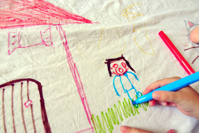 Βρήκα ένα παλιό λευκό σεντόνι και το μετέτρεψα σε καμβά αφού θα φιλοξενούσε τις δημιουργίες των μικρών μου ζωγράφων…;)